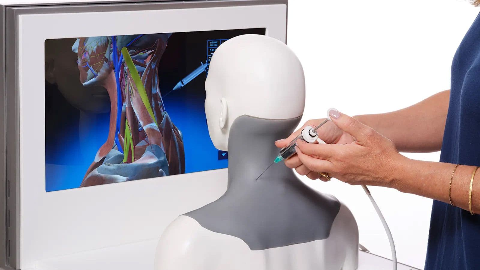 The AR version of the simulator uses a custom, touch-sensitive syringe that interfaces with a tablet to guide practitioners with the same precise placement and dosing information as the mannequin model. AR technology lets users “practice” on actual bodies by revealing internal musculature and vascular structures.