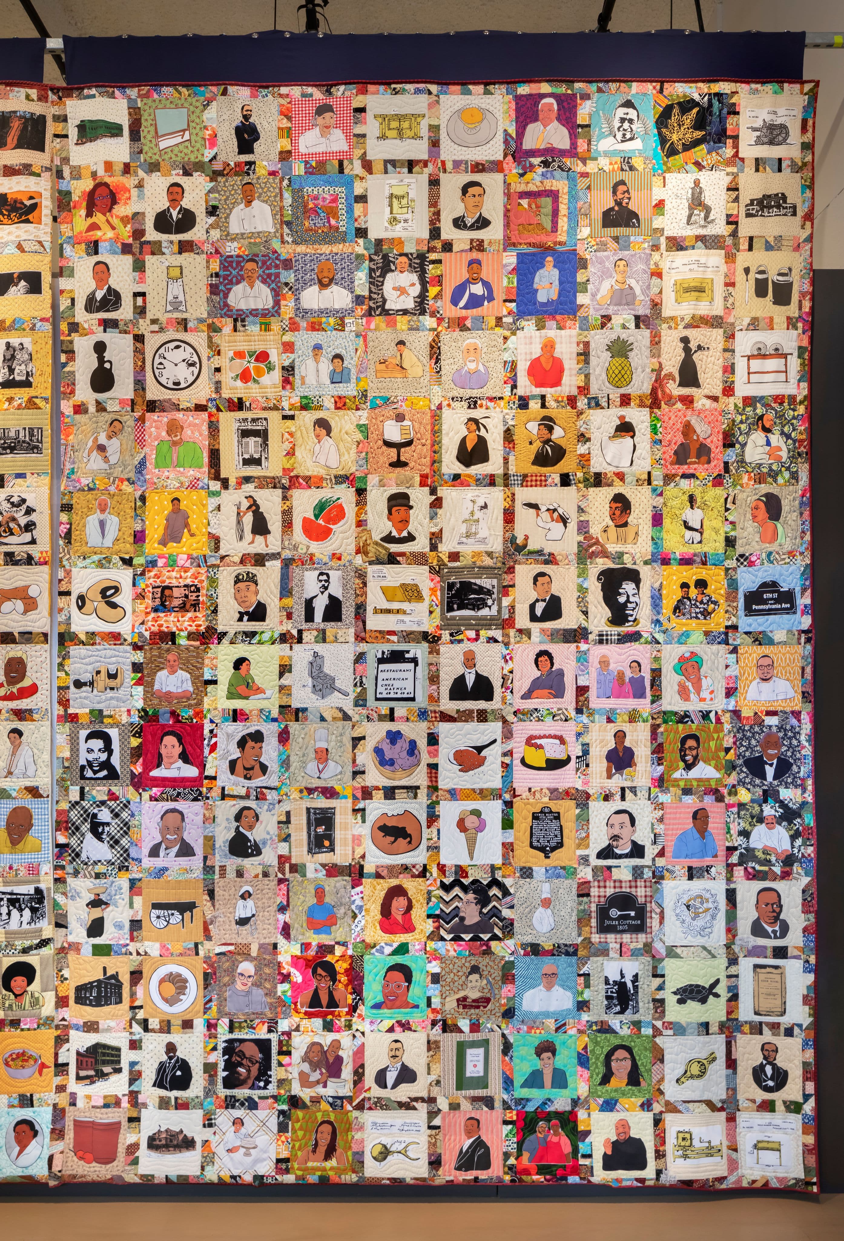 A monumental quilt by the Harlem Quilters Guild anchors the exhibit. Inspired by its bold colors and eclectic collaging, we give visitors the option to snack on bite-sized information or get their fill from a deeper dive. Like cooking a meal, the experience lovingly and beautifully combines disparate elements to elevate the whole.