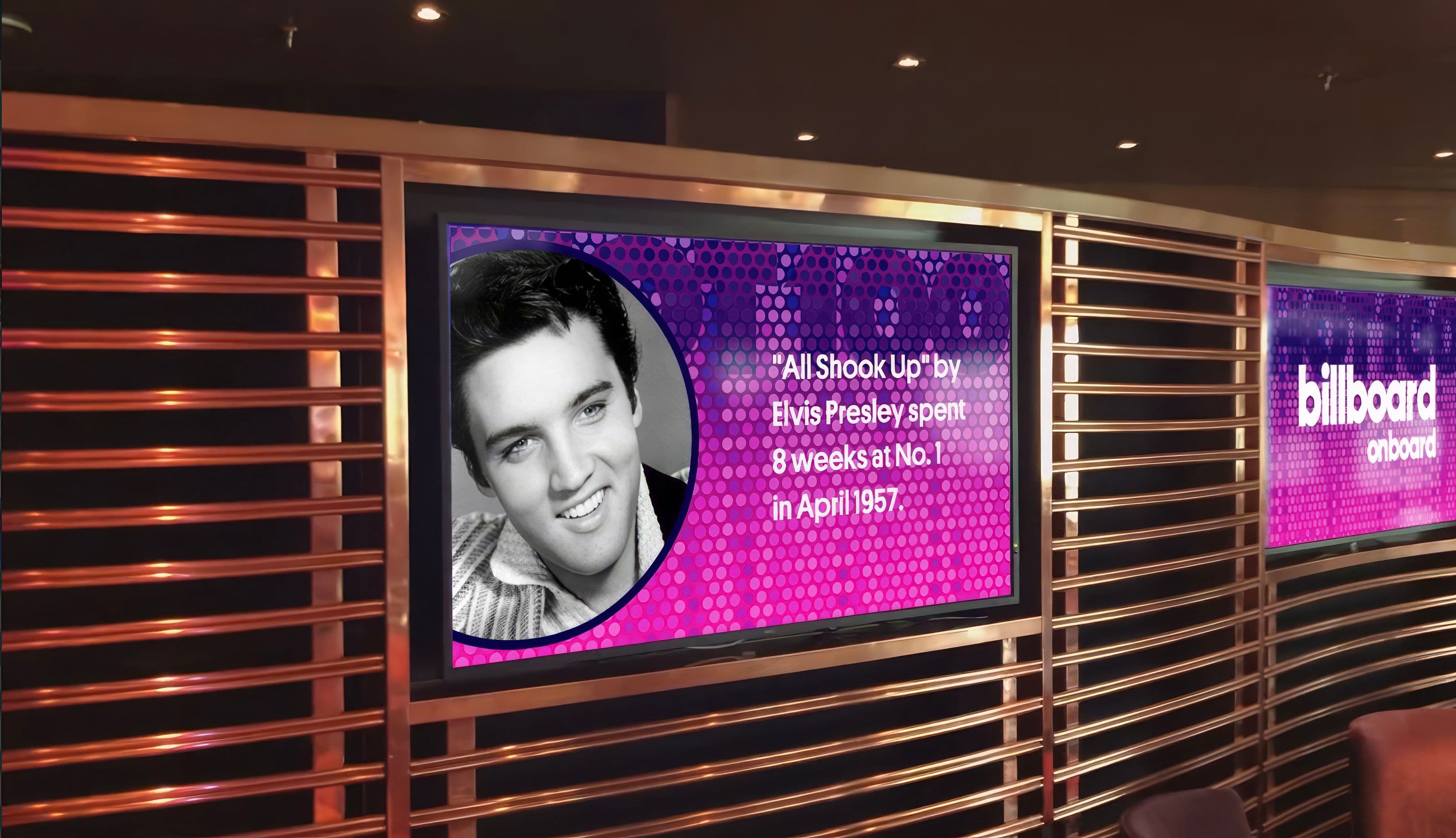 While live performers entertain guests, synchronized Billboard-branded video snippets display music trivia plus Billboard stats by artists like The Temptations, Martha and the Vandellas, and Frank Sinatra.