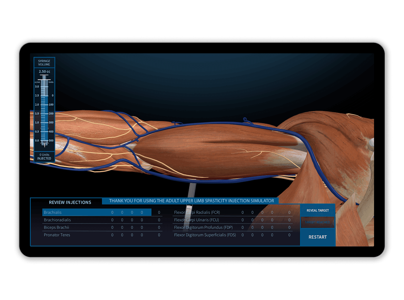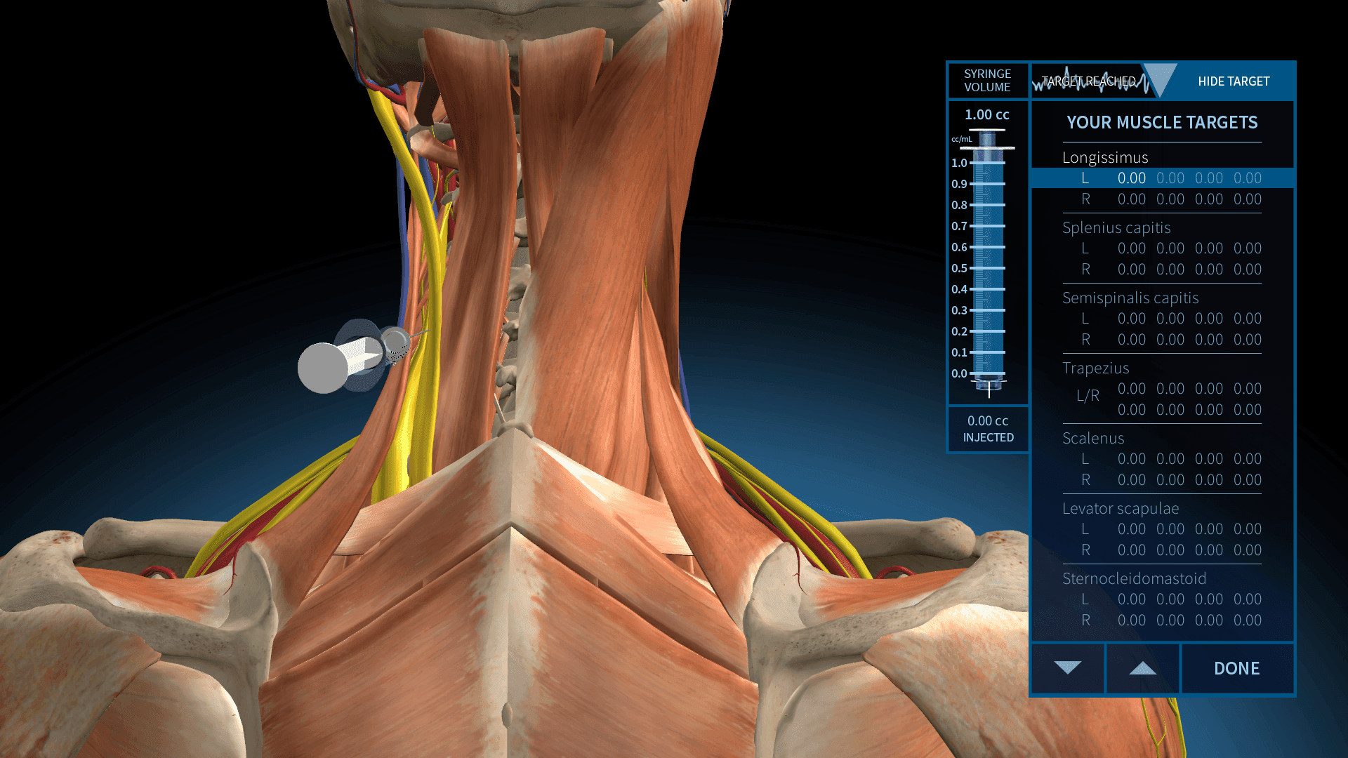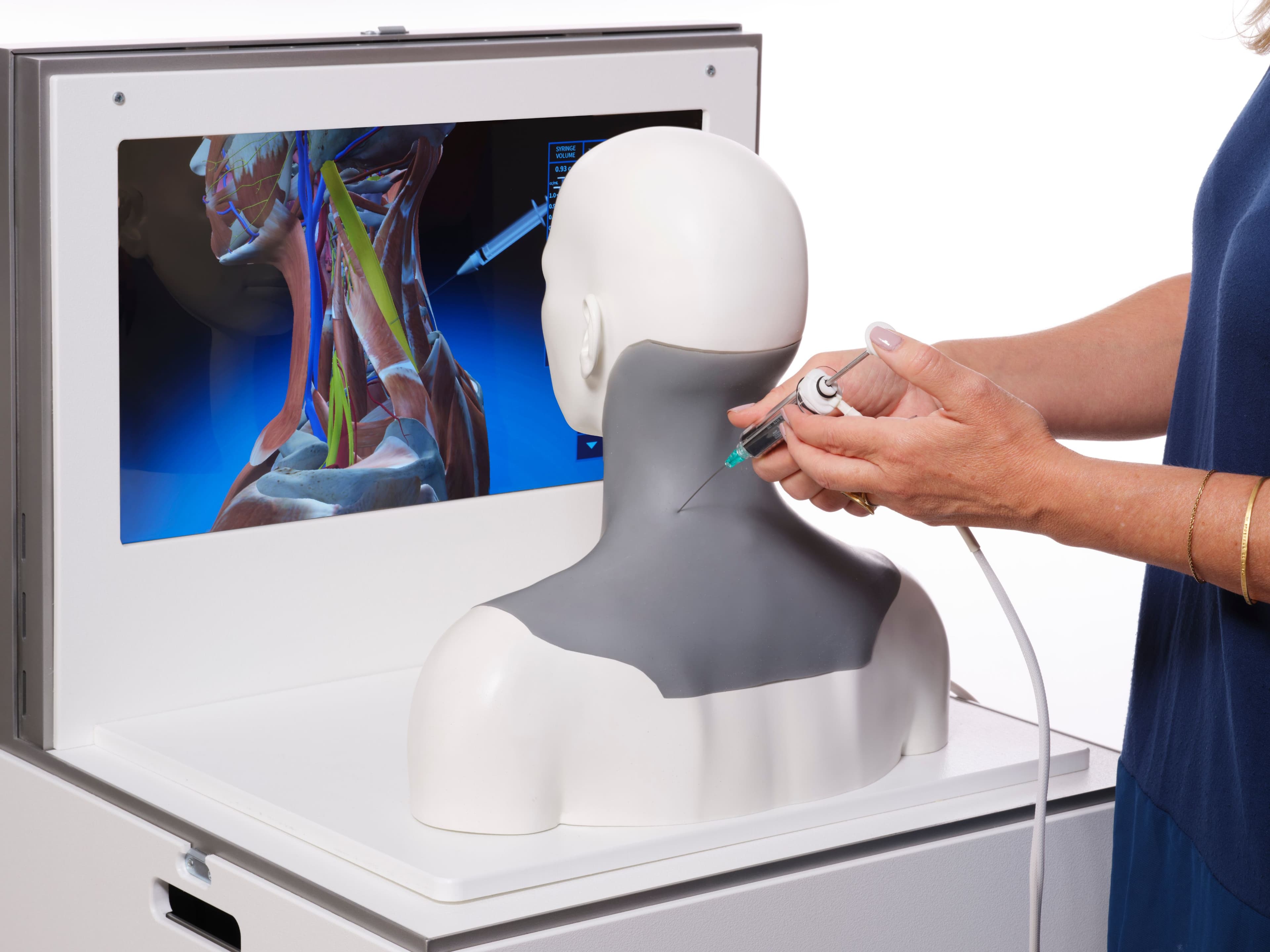 The AR version of the simulator uses a custom, touch-sensitive syringe that interfaces with a tablet to guide practitioners with the same precise placement and dosing information as the mannequin model. AR technology lets users “practice” on actual bodies by revealing internal musculature and vascular structures.